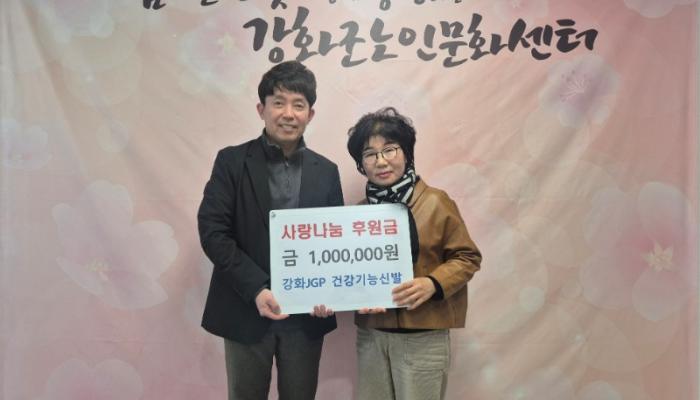 강화군노인문화센터(센터장 우석순)가 지난 17일, JGP 강화점(대표 임연화)으로부터 어르신 복지 증진을 위한 후원금 100만 원을 기탁받았다고 전했다.JGP 강화점은 길상면 온수리에 있는 건강 기능 신발 제작·판매업체로, 임연화 대표는 평소 노인문화센터를 직접 이용하면서 느낀 경험을 계기로 기탁에 앞장서게 되었다.임 대...