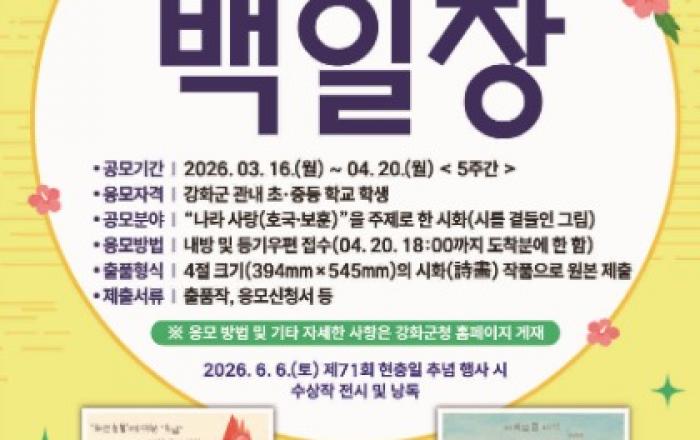 강화군(군수 박용철)은 오는 4월 20일까지 관내 초·중학교 학생들을 대상으로 ‘2026년 제3회 강화군 호국 백일장 공모전’을 개최한다고 밝혔다.이번 공모전은 순국선열과 호국영령의 숭고한 나라사랑 정신을 기리고, 미래세대인 학생들에게 호국과 보훈의 의미를 되새기는 기회를 제공하기 위해 마련됐다. 지난 2024년 첫 회를 시작으로 올해 세...