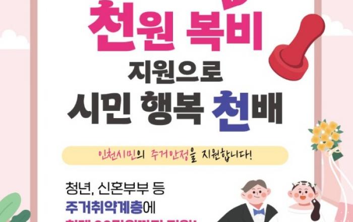 인천광역시(시장 유정복)는 무주택 청년과 신혼부부 등 주거취약계층의 주거비 부담을 덜어주기 위해 추진 중인‘천원 복비 지원사업’이 시민들의 ...