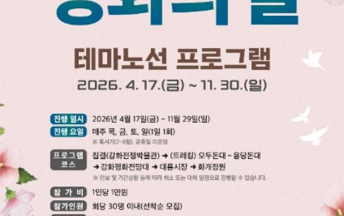 강화군(군수 박용철)은 오는 4월 17일부터 11월 30일까지 비무장지대(DMZ) 인근을 따라 조성된 ‘DMZ 평화의 길 테마 노선’ 프로그램을 본격적으로 운영한다고 밝혔다.‘DMZ 평화의 길 테마 노선’은 2019년 조성된 이래, 비무장지대 접경지역에서 생태, 문화, 역사 자원을 통해 평화와 안보의 소중함을 생생하게 체험할 수 있도록 만...