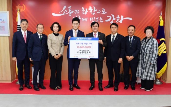 강화군(군수 박용철)이 14일, 하늘중앙교회(담임목사 박윤호)에서 교회 설립 10주년을 맞아 지역사회 어려운 이웃을 돕기 위한 지정 기탁금 1천만 원을 강화군에 기탁했다고 밝혔다.이번에 기탁된 성금은 인천사회복지공동모금회를 통해 관내 저소득층 및 복지 사각지대 이웃들을