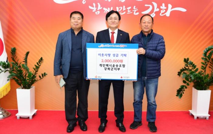 강화군(군수 박용철)은 개인택시운송사업조합 강화군지부(지부장 김영학)에서 지난 19일 어려운 이웃을 돕기 위해 성금 200만 원을 기탁했다고 밝혔다.이번 성금은 조합원들이 한마음으로 정성을 모아 마련한 것으로, 경제적 어려움을 겪는 강화군 내 취약계층 가구 지원에 사용