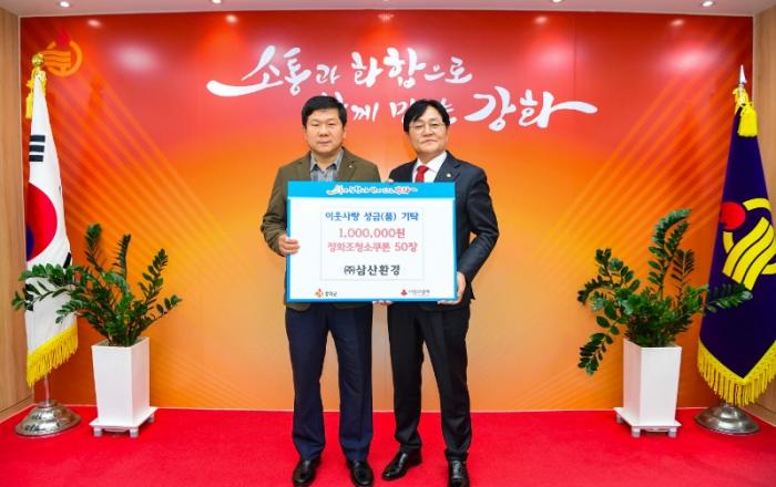 강화군(군수 박용철)은 지난 10일 삼산환경(대표 한의탁)에서 지역사회 나눔 실천을 위해 성금 100만 원과 정화조 청소 쿠폰 50장을 공동모금회를 통해 기탁했다고 밝혔다. 이번 기탁은 지역 내 취약계층 주거환경 개선과 생활 안정을 돕기 위한 것으로, 정화조 청소 쿠폰