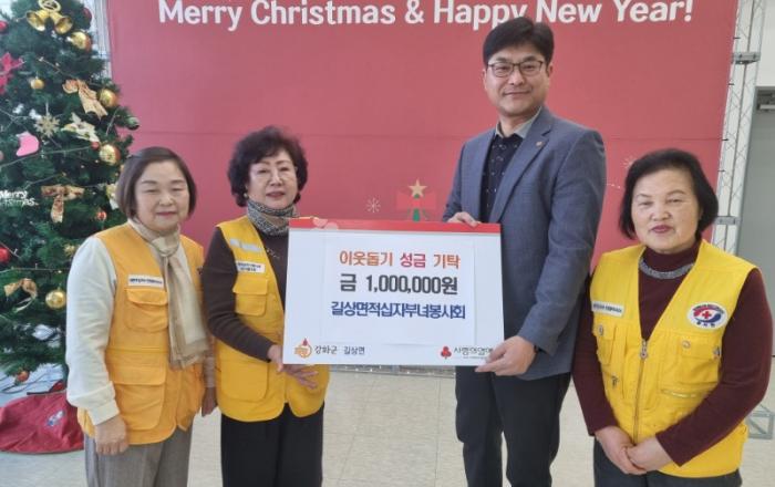 강화군 길상면(면장 서광석)이 지난 26일, 길상면 적십자부녀봉사회(회장 염순덕)에서 이웃 돕기 성금 1백만 원을 기탁했다고 밝혔다.길상면 적십자부녀봉사회는 매년 성금뿐만 아니라 구호 물품 전달, 화재 피해 가구 청소 봉사, 위기가구 긴급 지원 등의 활동을 꾸준히 실천