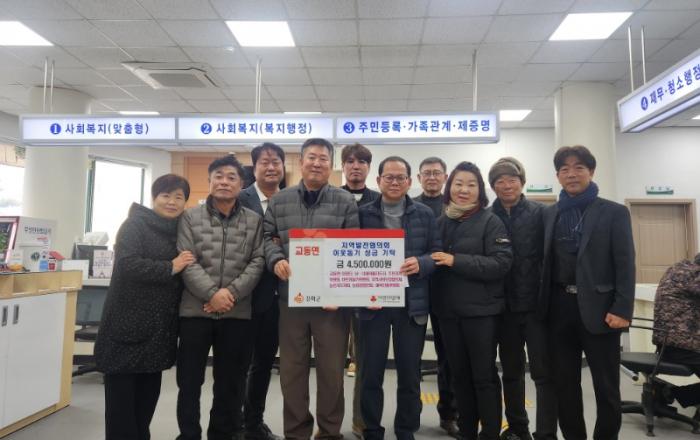 강화군 교동면(면장 최동관)은 지난 29일, 교동면 지역발전협의회(이장단, 남녀새마을지도자, 주민자치위원회, 지역사회보장협의체, 바르게살기위원회, 농촌지도자회, 농업경영인회, 체육진흥후원회)에서 화재로 피해를 입은 가구를 위한 성금 450만 원을 전달했다고 밝혔다.이번