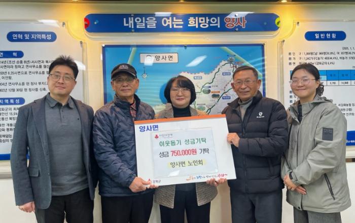 강화군 양사면(면장 이지영)은 지난 29일, 양사면 노인회(회장 이경진)에서 연말을 맞아 어려운 이웃을 돕고자 사회복지공동모금회를 통해 성금을 75만 원을 기탁했다고 전했다.이번 성금은 한 해를 마무리하며 지역사회와 함께하는 나눔을 실천하고자 회원들의 뜻을 모아 마련됐