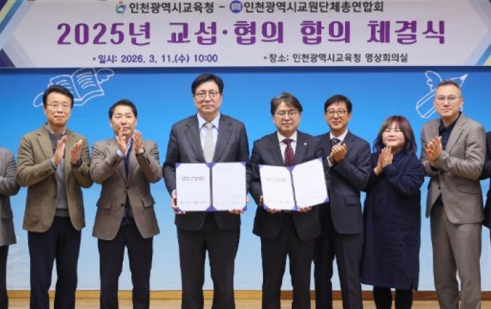 인천광역시교육청(교육감 도성훈)은 11일 인천교원단체총연합회(회장 윤홍기, 이하 인천교총)와 ‘교섭‧협의 합의서’를 체결했다.이번 교섭·협의는 지난해 11월 인천교총의 요구로 시작되었으며, 양측은 수차례의 실무교섭을 거치며 긴밀히 소통해 합의점을 도출했다.최종 합의 사