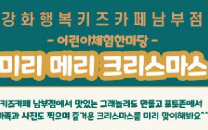 강화군시설관리공단(이사장 박영길)이 오는 13일, 강화행복 키즈카페 남부점에서 연말을 맞아 어린이들이 즐겁고 따뜻한 추억을 만들 수 있는 특화 프로그램을 운영한다고 밝혔다. 이번 프로그램은 관내·외 어린이들에게 창의적 체험의 기회를 제공하고 가족이 함께 즐길 수 있는