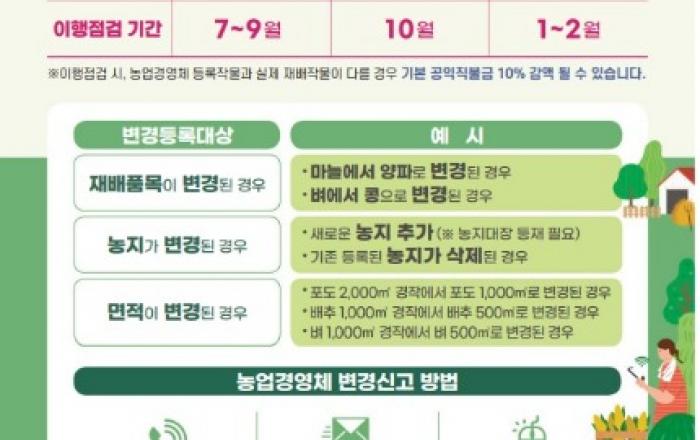 국립농산물품질관리원 경기지원 강화사무소(소장 손병철, 이하 강화농관원)은 농업경영체 정보의 정확도를 높이기 위해 9월부터 10월까지 무·배추 추계작물 정기 변경신고 기간을 본격적으로 운영한다. 농업경영체 등록 농업인은 공익직불 등 농업 관련 융자·보조 사업* 지원혜택