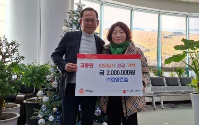 강화군 교동면(면장 최동관)은 지난 18일, ㈜효영건설(대표 나인숙)에서 연말을 앞두고 면사무소를 찾아 관내 어려운 이웃을 위한 성금 200만 원을 전달했다고 밝혔다.이번 기탁금은 사회복지공동모금회를 통해 관내 저소득 노인, 장애인 등 교동면에 도움이 필요한 이웃을 위