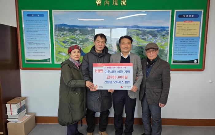 강화군 선원면(면장 이정실)은 지난 22일, 선원면 오아시스 밴드(단장 표경호)에서 면사무소를 방문해 도움이 필요한 이웃을 위해 사용해 달라며 성금 50만 원을 기탁했다고 전했다. 이번 성금은 오아시스 밴드의 버스킹 수익금을 기부한 것으로, 기탁된 성금은 사회복지 공동
