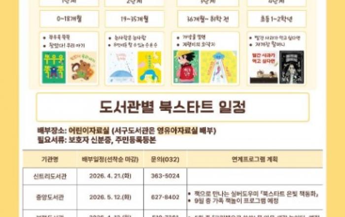 인천광역시교육청 공공도서관과 평생학습관은 영유아 및 초등 1·2학년 학생을 대상으로 ‘2026년 북스타트 사업’을 시작한다.‘책과 함께 인생을 시작하자’라는 슬로건 아래 운영되는 이번 사업은 아동의 발달단계에 맞춘 도서가 포함된 ‘책꾸러미’를 무료로 제공함으로써, 아이