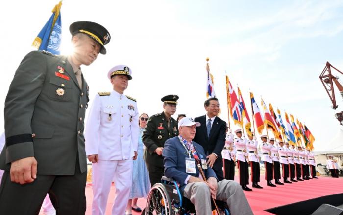 ▲ 유정복 인천광역시장이 제75주년 인천상륙작전일인 15일 내항8부두에서 열린 '제75주년 인천상륙작전 전승기념행사'에서 참전용사와 입장하고 있다.인천광역시(시장 유정복)와 인천 중구(구청장 김정헌)는 9월 14일 동인천역 남광장에서 출발해 중구청까지 이어진 1.6km