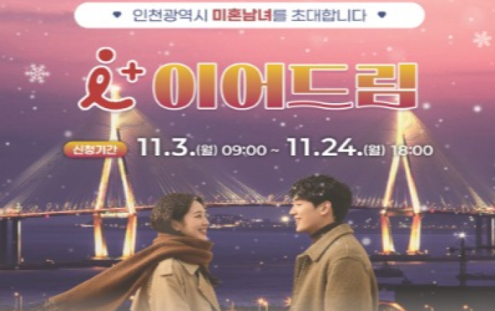 인천광역시(시장 유정복)와 인구보건복지협회 인천지회(회장 박규홍)는 인천 청년 미혼남녀의 만남을 지원하기 위해 5차‘아이플러스(i+) 이어드림’참가자를 오는 11월 3일부터 11월 24일까지 3주간 모집한다고 밝혔다.이번 프로그램은 인천에 주민등록이 되어 있거나 인천