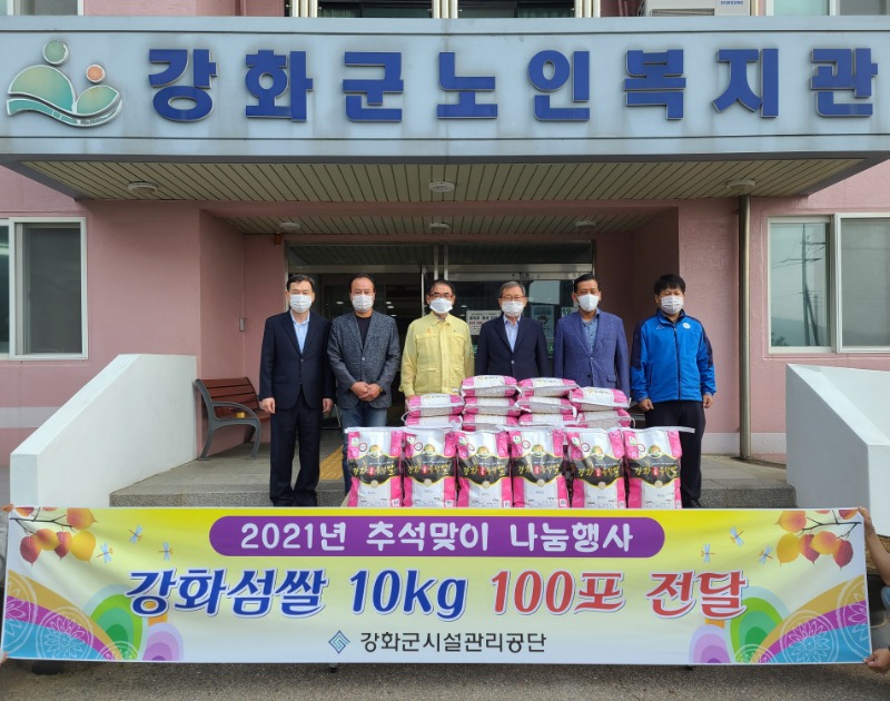 강화군시설관리공단(이사장 한기량)은 추석을 맞아 대한노인회 인천강화군지회(회장 장기천)에 방문해 강화섬쌀(10kg) 100포를 기탁했다고 12일 밝혔다.