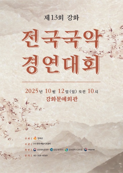 강화군(군수 박용철)은 오는 10월 12일 강화문예회관에서 ‘제13회 강화 전국 국악경연대회’를 개최한다고 밝혔다.