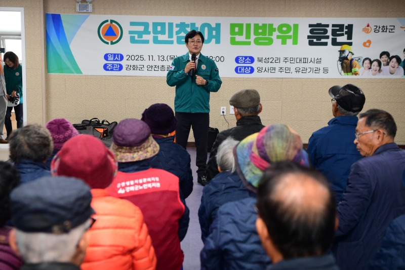 강화군(군수 박용철)이 지난 13일, 북성2리 주민 대피 시설 일대에서 ‘2025년도 군민 참여 재난 대비 민방위 통합 훈련’을 개최했다.