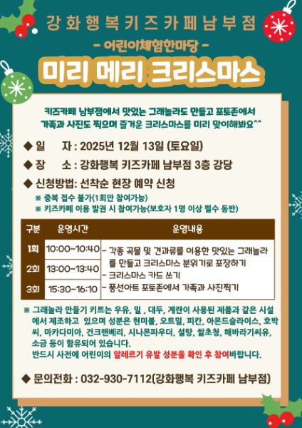 강화군시설관리공단(이사장 박영길)이 오는 13일, 강화행복 키즈카페 남부점에서 연말을 맞아 어린이들이 즐겁고 따뜻한 추억을 만들 수 있는 특화 프로그램을 운영한다고 밝혔다.