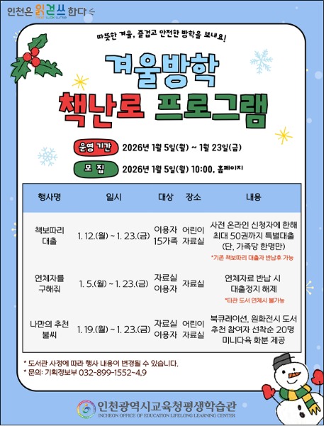 인천광역시교육청평생학습관(관장 이재길)은 겨울방학을 맞아 2026년 1월 ‘책난로’ 독서 프로그램을 운영한다.