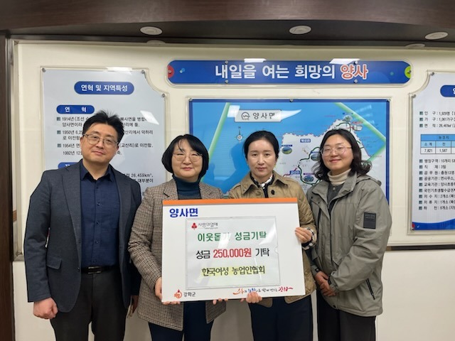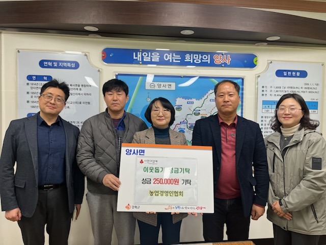 이에 이지영 양사면장도 “지역 단체들의 자발적인 나눔이 양사면을 더욱 따뜻하게 만들고 있다”며, “소중한 성금은 꼭 필요한 이웃들에게 정성껏 전달하겠다”고 감사의 뜻을 전했다.