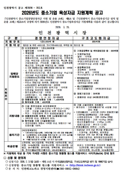 중소기업 육성자금 지원을 희망하는 기업은 2월 2일부터 인천시 중소기업 맞춤형 지원 시스템 ‘비즈오케이(BizOK)’(http://bizok.incheon.