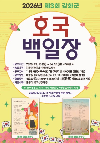 강화군(군수 박용철)은 오는 4월 20일까지 관내 초·중학교 학생들을 대상으로 ‘2026년 제3회 강화군 호국 백일장 공모전’을 개최한다고 밝혔다.