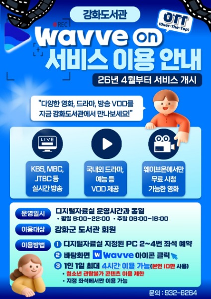 강화군(군수 박용철)은 오는 4월 7일부터 강화도서관 디지털자료실에서 OTT 영상 스트리밍 서비스인 ‘웨이브온(Wavve on)’을 이용할 수 있다고 밝혔다.