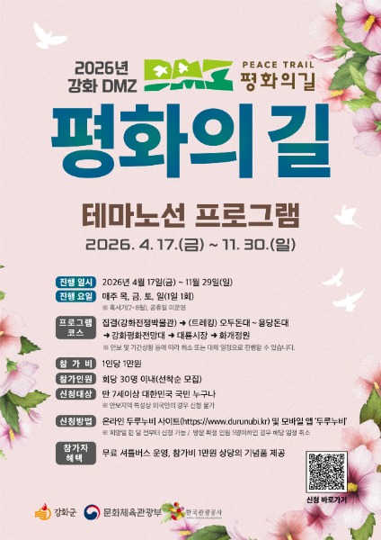 강화군, ‘DMZ 평화의 길’ 테마 노선 프로그램 본격 운영 최벽하 기자 발행 2026-04-17 16:59 Facebook Twitter band 네이버블로그 카카오스토리 카카오톡 글자작게 글자크게 <저작권자 ⓒ 강화투데이, 무단 전재 및 재배포 금지> 최벽하 기자 다른기사보기