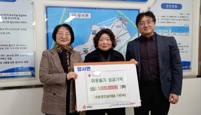 강화군 양사면(면장 이지영)은 지난 12일, 지역사회를 위한 기부 행렬이 이어지고 있다고 전했다.이날 효영건설(대표 나인숙)은 어려운 이웃을 위해 써달라며 100만 원을 기부했고, 양사면에 거주하는 한 주민(익명)도 100만 원을 잇달아 기부하며 나눔에 동참했다.기탁된 성금은 사회복지공동모금회를 통해 관내 저소득층과 복지...