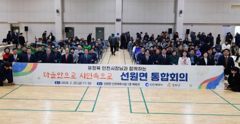 강화군(군수 박용철)은 20일 선원면 생활체육센터에서 유정복 인천시장과 함께 ‘마을 안으로, 시민 속으로’ 통합회의를 개최하고, 선원면의 인구 유입 증가에 따른 기반시설 확충 등 지역 현안을 주민들과 논의했다.‘마을 안으로, 시민 속으로’는 생활 현장...
