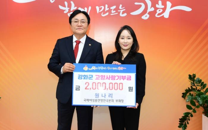 강화군(군수 박용철)은 지난 20일 원나리 국제여성총연맹한국본회(KGFWC) 부회장이 올해 ‘강화군 고향사랑기부제’의 11번째 고액 기부자로 참여했다고 밝혔다. 원 부회장은 이번에 200만 원을 기부했다.원 부회장은 지난 9월 26일 강화 평화전망대에서 열린 ‘평화통일