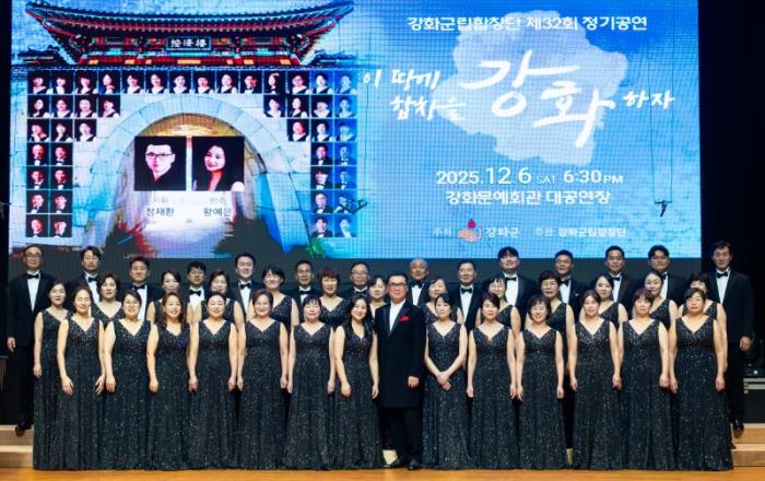 강화군(군수 박용철)은 강화군립합창단이 지난 6일 강화문예회관에서 ‘이 땅에 합창을 강화하자’ 주제로 제32회 정기 공연 ‘사랑의 열린음악회’를 열었다고 밝혔다. 이날 음악회에는 정재환 지휘자와 황예은 반주자 아래 총 8곡의 합창 무대가 펼쳐졌으며, 판소리, 현대무용,