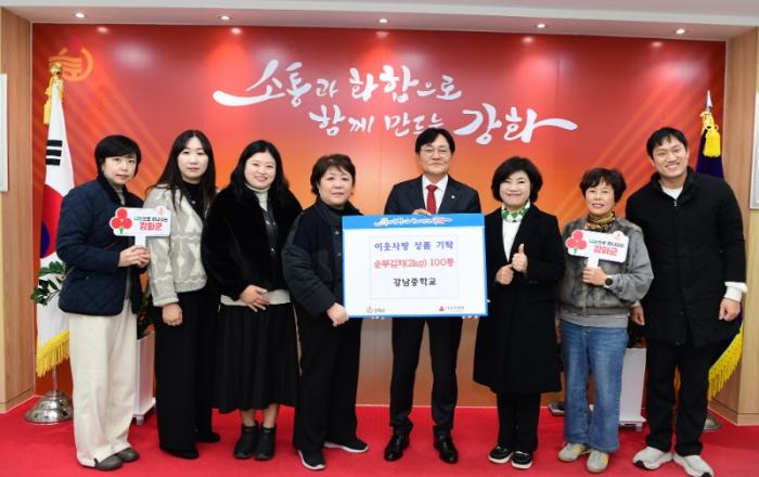 강화군(군수 박용철)은 지난 10일 강남중학교 교사, 학부모, 학생들이 함께 참여해 준비한 순무 김치(2kg) 100통을 공동모금회를 통해 기탁했다고 밝혔다. 이번 나눔은 학교 구성원들이 직접 담그고 준비한 김치를 어려운 이웃에게 전달하고자 마련된 활동으로, 강화군 푸