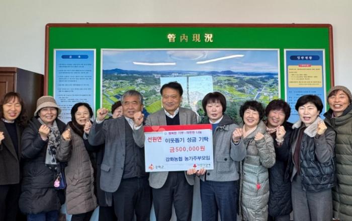 강화군 선원면(면장 이정실)은 지난 31일, 강화농협 농가주부모임(회장 황인옥)에서 동절기 관내 취약계층과 어려운 이웃을 위한 이웃돕기 성금 50만 원을 기탁했다고 전했다.강화농협 농가주부모임은 매년 관내 도움이 필요한 취약계층을 위한 성금과 현물 기탁, 봉사활동 등을