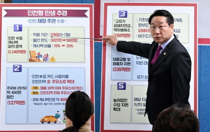 ▲ 유정복 인천광역시장이 14일 시청 브리핑룸에서 '인천형 민생체감 추경예산' 관련 기자회견을 하고 있다.인천광역시(시장 유정복)는 중동 전쟁 장기화로 인한 고유가, 고환율 위기를 극복하기 위해 인천만의 독자적인 민생 지원 대책을 마련한다고 밝혔다.정부는 4월