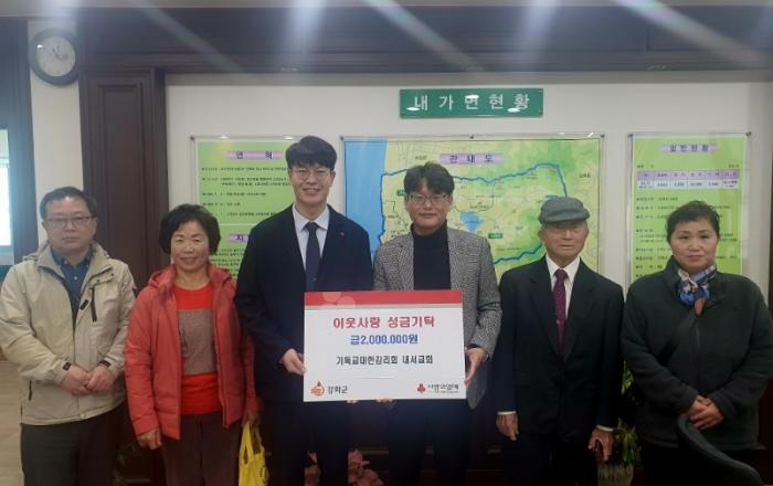 강화군 내가면(면장 차은석)은 기독교대한감리회 내서교회(담임목사 이성호)에서 지난 6일, 지역 내 어려운 이웃을 위해 써달라며 성금 200만 원을 기탁했다고 밝혔다. 이번 기탁은 지역사회에 따뜻한 나눔의 정신을 실천하기 위해 마련된 것으로, 전달된 성금은 홀몸 어르신과