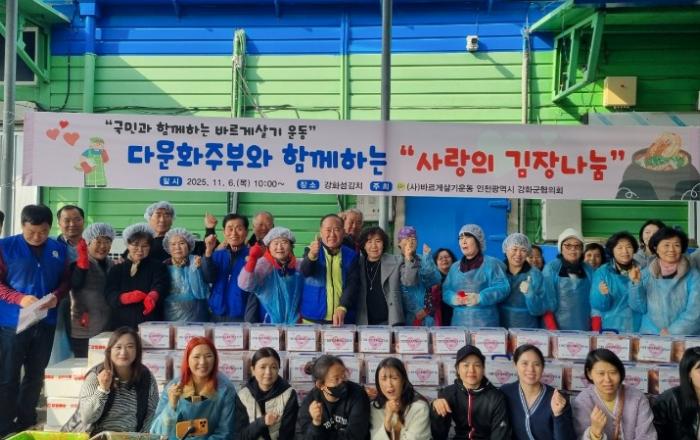 강화군(군수 박용철)은 바르게살기운동 강화군협의회(회장 임인관)에서 지난 6일 다문화 주부와 함께하는 사랑의 김장 나눔 행사를 개최했다고 밝혔다.이날 행사에는 협의회 회원과 다문화 주부 등 60여 명이 참여해 정성껏 김장 김치를 담갔으며, 완성된 김치는 지역 내 200