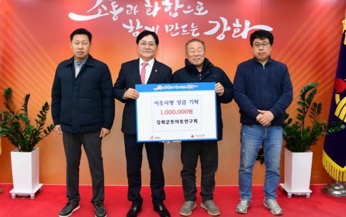 강화군(군수 박용철)은 강화군 토마토연구회(회장 강진구)가 지난 18일 사회복지공동모금회를 통해 성금 100만 원을 기탁했다고 밝혔다.강화군 토마토연구회 회원들은 한 해 동안 토마토 재배와 연구 활동을 통해 얻은 수익금 일부를 지역 사회에 환원하고자 뜻을 모았다토마토연