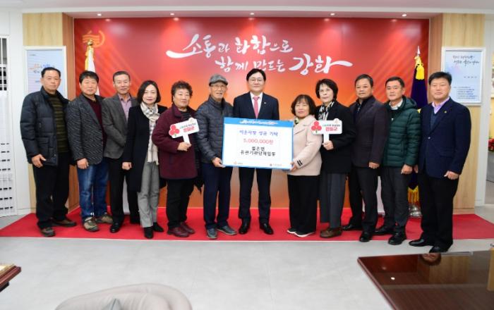 강화농협(조합장 이한훈)은 지난 16일 강화군(군수 박용철)을 방문해 연말연시를 맞이하여 불우이웃 성금 2,000만원을 기탁했다고 밝혔다.이날 전달식에는 강화농협 이한훈 조합장, 조규남 상임이사, 류우근 수석이사, 남궁혁 기획상무, 이선영 신용상무, 배은상 노조지회장