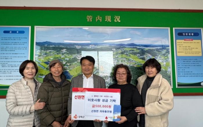 강화군 선원면(면장 이정실)은 지난 26일, 한국자유총연맹 선원면분회(회장 이수정)에서 관내 어려운 이웃을 돕기 위한 성금 50만 원을 기탁했다고 밝혔다.이번 성금은 회원들이 정성껏 모은 회비로 마련된 것으로, 인천 사회복지공동모금회를 통해 관내 취약계층을 위한 사업에