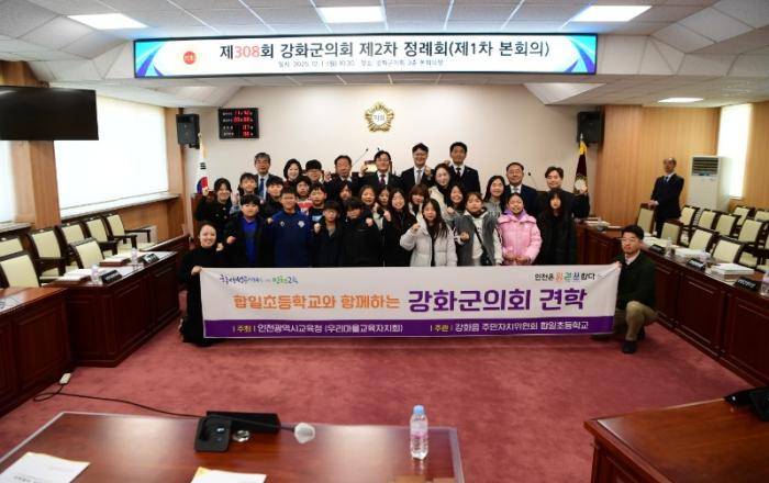 강화군의회(의장 한승희)는 1일 청소년 열린 의회교실의 일환으로 제308회 제2차 정례회 본회의에 합일초등학생들이 방청하며 의정 체험 시간을 가졌다고 밝혔다.이번 방청은 학생들이 실제 의회 본회의 진행 과정을 직접 지켜보며, 지방의회의 역할을 이해하고 민주적 의사결정