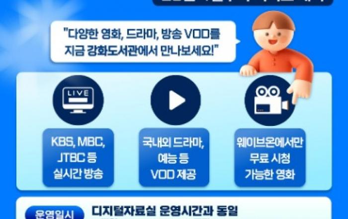 강화군(군수 박용철)은 오는 4월 7일부터 강화도서관 디지털자료실에서 OTT 영상 스트리밍 서비스인 ‘웨이브온(Wavve on)’을 이용할 수 있다고 밝혔다.이번 서비스는 강화도서관 이용자에게 다양한 문화·지식 콘텐츠를 제공하기 위해 도입됐다.‘웨이브온’은 국내외 드라