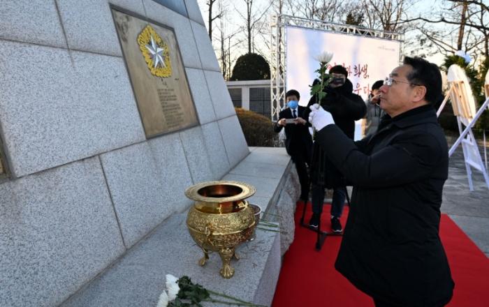 ▲ 유정복 인천광역시장이 2일 2026년 병오년 새해를 맞아 미추홀구 수봉공원 6·25 참전 인천지구 전적비에서 참배를 하고 있다.유정복 인천시장은 1월 2일 오전 8시 30분, 인천수봉공원 내 6.25참전 인천지구 전적비를 찾아 국가를 위해 헌신하신 순국선열