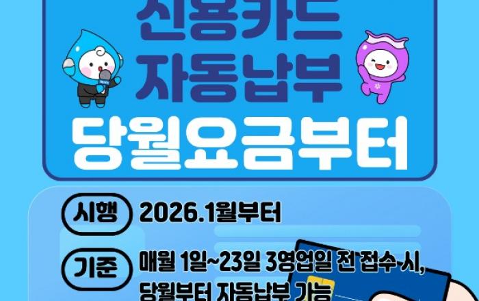 인천광역시(시장 유정복) 상수도사업본부는 시민 편의 중심의 수도요금 납부 환경을 조성하기 위해, 신용카드 자동납부를 신청한 달부터 바로 적용할 수 있도록 제도를 개선해 시행했다고 1월 2일 밝혔다.그동안 신용카드 자동납부 제도는 금융결제원 요구에 따라 신청일과 익월 초