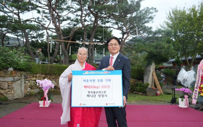 강화군(군수 박용철)은 지난 20일 화도면 마니산에 위치한 장엄사에서 어려운 이웃을 돕기 위해 자비나눔 백미(10kg) 100포를 기부했다고 밝혔다. 이날 기탁식은 장엄사 주지 혜선스님을 비롯한 사찰 관계자들과 박용철 강화군수가 참석한 가운데 진행되었으며, 전달된 쌀