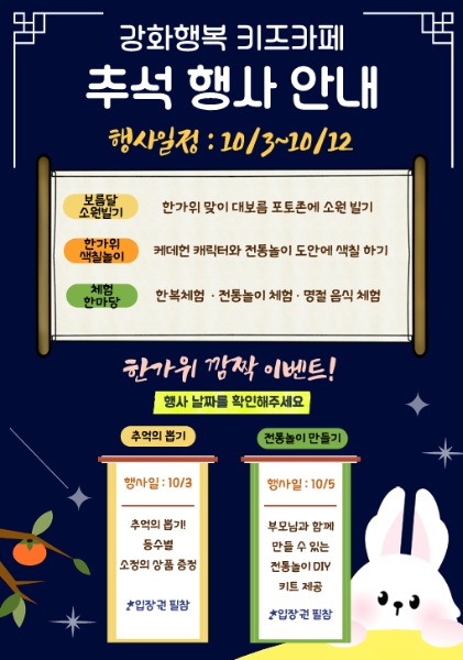 강화군행복센터(센터장 황순길)는 다가오는 명절을 맞아 강화행복 키즈카페에서 오는 3일~12일, 추석 특별 행사를 진행한다고 밝혔다.