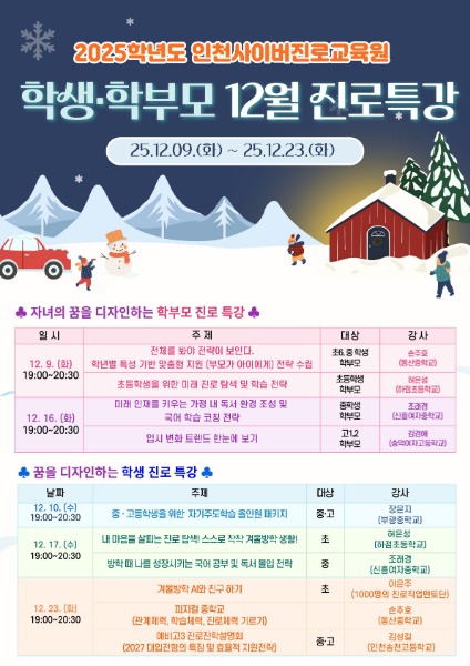특강은 인천 관내 초·중·고 학생과 학부모 누구나 12월 3일부터 인천사이버진로교육원 누리집(https://cyberjinro.ice.go.kr/)에서 신청할 수 있으며, 모든 강의는 실시간 온라인 방식으로 진행된다.