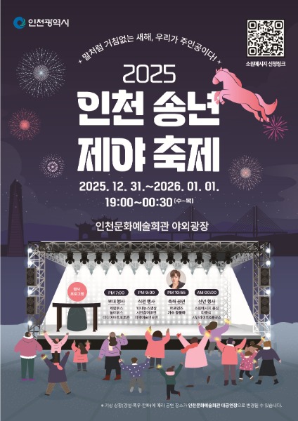 인천광역시(시장 유정복)는 오는 12월 31일, 한 해의 마무리와 새해의 시작을 시민과 함께 기념하기 위해 ‘2025 인천 송년제야 축제’를 인천문화예술회관 야외광장에서 개최한다고 밝혔다.