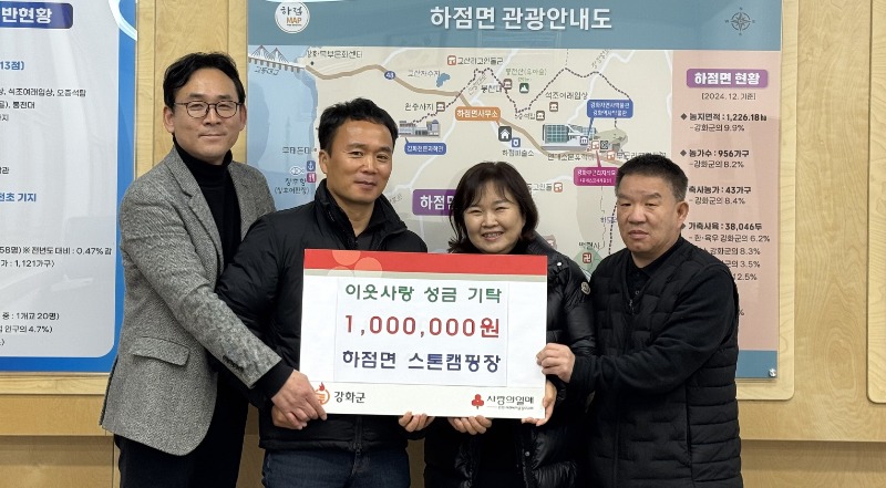 강화군 하점면(면장 이철호)은 지난 22일, 하점면 스톤캠핑장을 운영하는 강유시, 박진영 부부가 관내 어려운 이웃을 돕기 위한 성금 100만 원을 기부했다고 전했다.