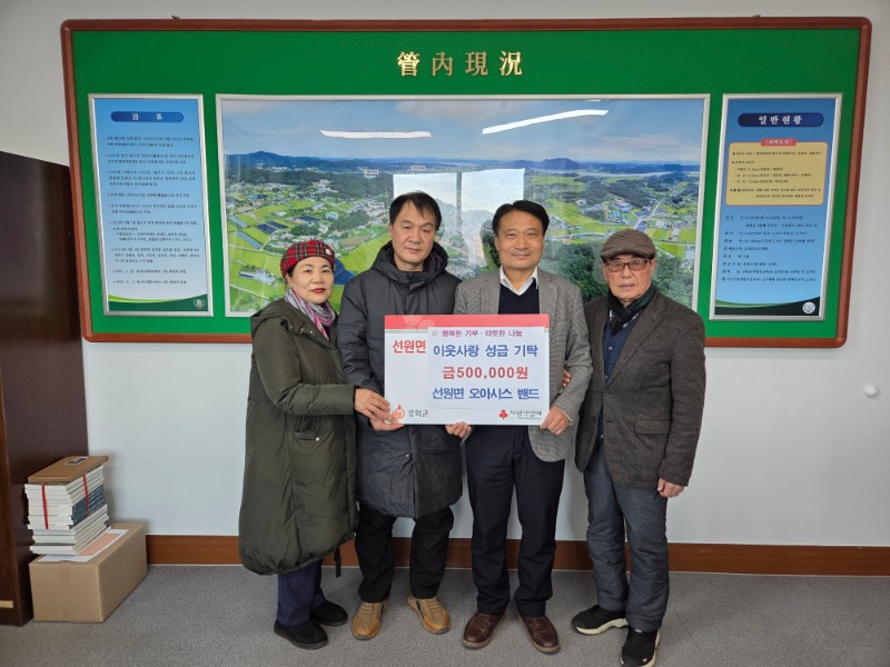 강화군 선원면(면장 이정실)은 지난 22일, 선원면 오아시스 밴드(단장 표경호)에서 면사무소를 방문해 도움이 필요한 이웃을 위해 사용해 달라며 성금 50만 원을 기탁했다고 전했다.